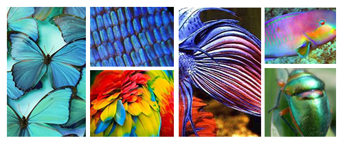-- 生物的演變與進化。如孔雀的羽毛、蛇或魚的鱗片、甲蟲的表殼、蝴蝶的翅膀,在不同的角度下,可呈現出不同的色彩。